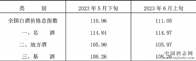 表1 2023年5月下旬——2023年6月上旬全國白酒環比價格指數表